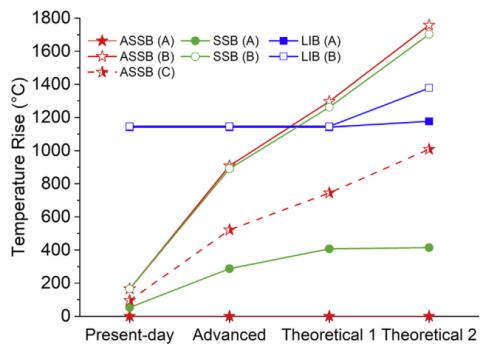 結(jié)果表明,短路的全固態(tài)電池具有比傳統(tǒng)鋰離子電池高得多的溫度,這些熱量的釋放可能會通過易燃包裝或附近的其它材料而導(dǎo)致火災(zāi)。